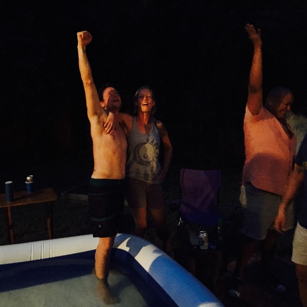 A man with no shirt stands with one foot in a child's swimming pool at night.