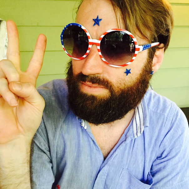 Man wearing blue denim shirt and also wearing red white and blue sun glasses.