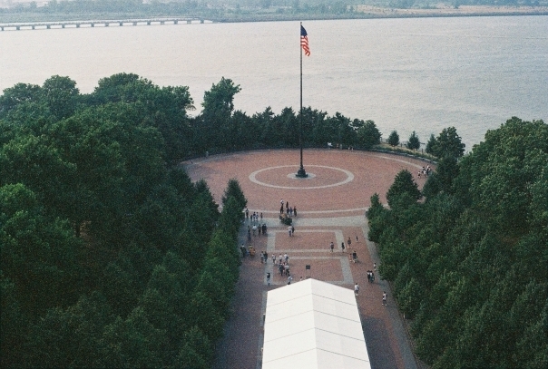 A little gray outside, people walking around and toward a circle where it meets the river and an American Flag is in the middle of the circle.