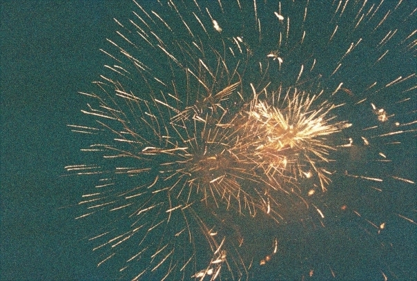 Bright orange fireworks are exploding in the sky directly over the photographer.