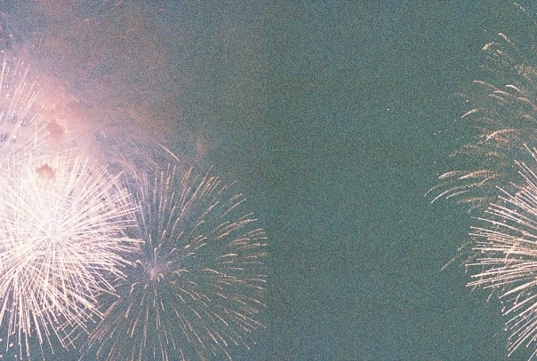 Three pink fireworks explosions turn the dark night sky into a pale blue.