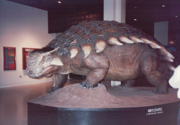 This is a replica of a large, hard-scaled and thorny prehistoric creature on display in a museum.