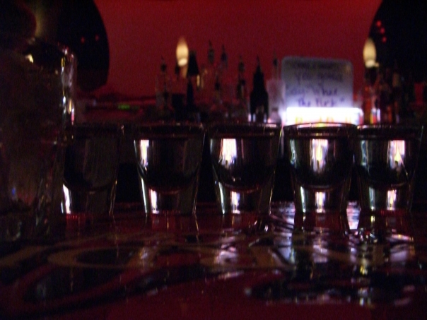 shot glasses lined up on a bar and probably filled with some kind of alcohol like vodka