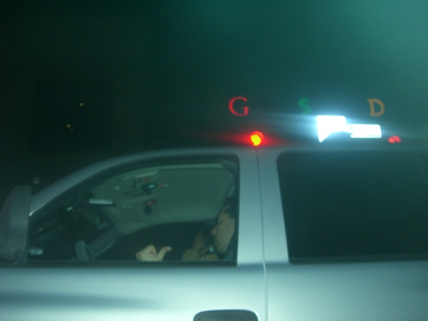 Driver of a silver utility truck points and talks on mobile phone at night.