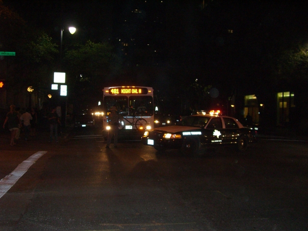 A police car with flashing lights has blocked this bus during an evening traffic stop.