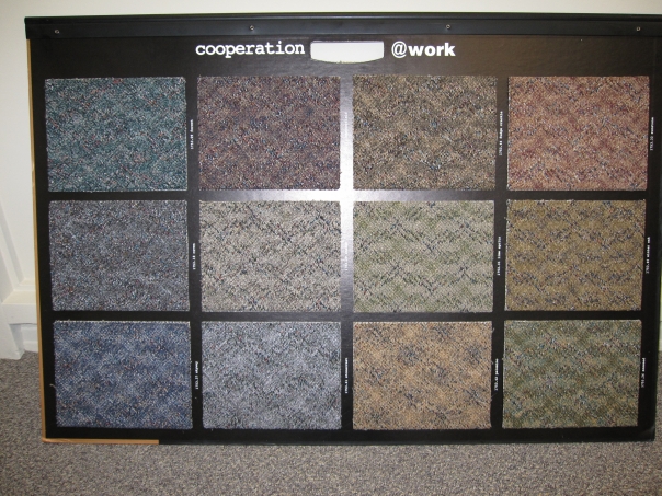 12 pieces of carpet that are put on a display case for demonstration.