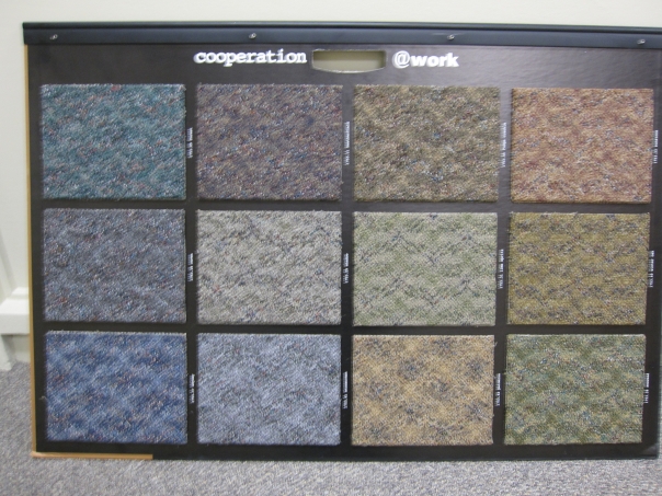 Assortment of colorful carpet samples sitting on the wall of a store.