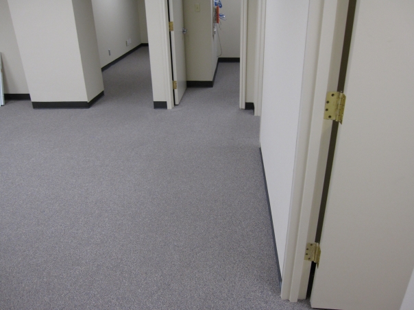 The white hallway with blue carpet has many white doors.