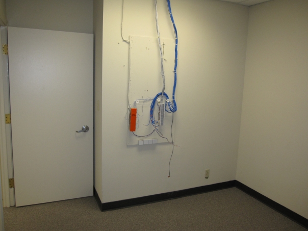 The colored red, blue and silver electrical wiring on the wall looks stark in this white empty room.