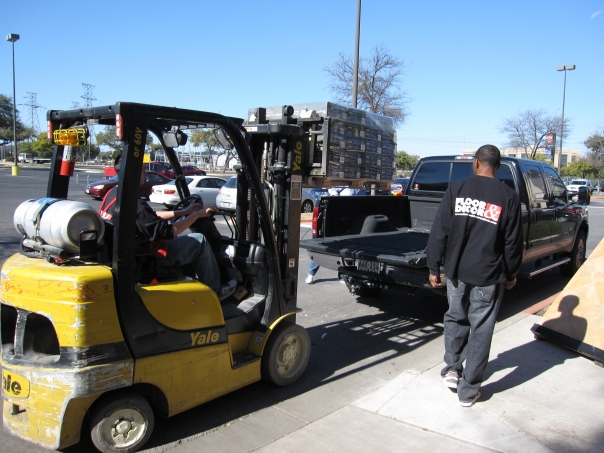 This man in the yellow forklift is unloading cargo from the back of a black pickup truck as another man in black watches.