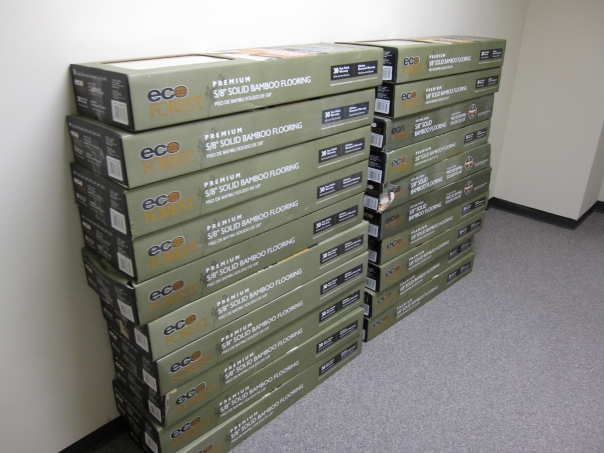 Stacked boxes of bamboo flooring are lining a white wall on a white floor.