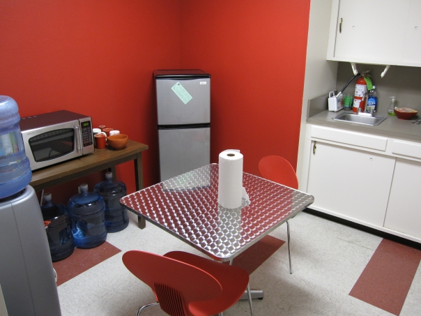 This brightly colored office kitchen has been kept clean and has all of the basic amenities.