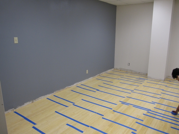 The floor is being taped for painting using blue painters tape in straight lines.