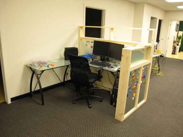 The desk has a barrier that is made of wood with a magnet board on the outside.