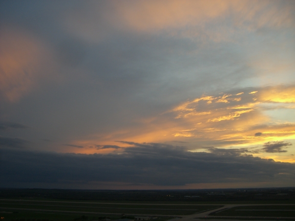 Sunrise over the runway at an unnamed airport with possible change of weather coming in, in the darker clouds. Beautiful Picture. High Low clouds on the horizon.