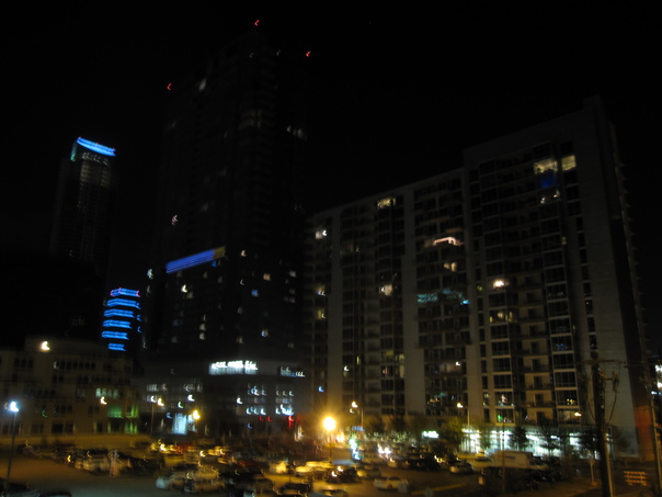 The night time picture of the city includes several high rise buildings and a parking lot