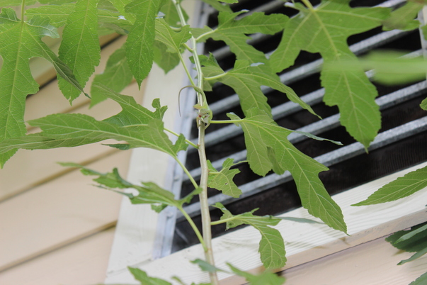 Green leaves growing up the side of the building.