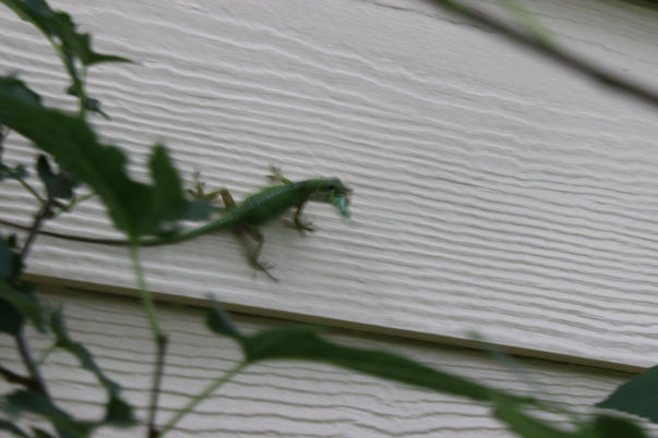 A green lizard with a green bug in it's mouth is crawling across some white siding on a building.