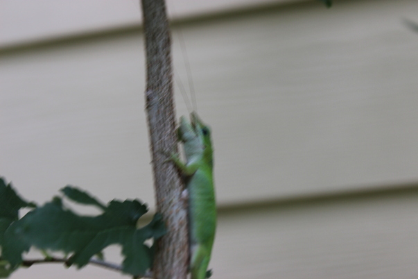 While cutting down one of my backyard trees I came across a lizard eating a grasshopper.