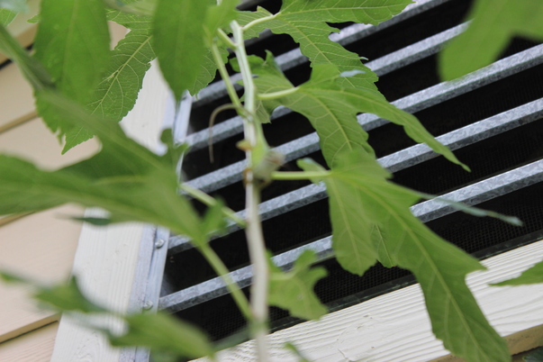 While cutting down one of my backyard trees I came across a lizard eating a grasshopper.
