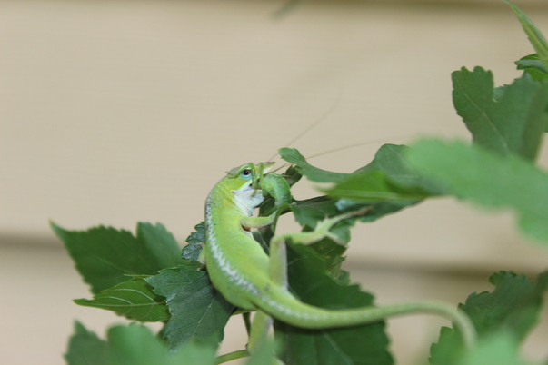 While cutting down one of my backyard trees I came across a lizard eating a grasshopper.
