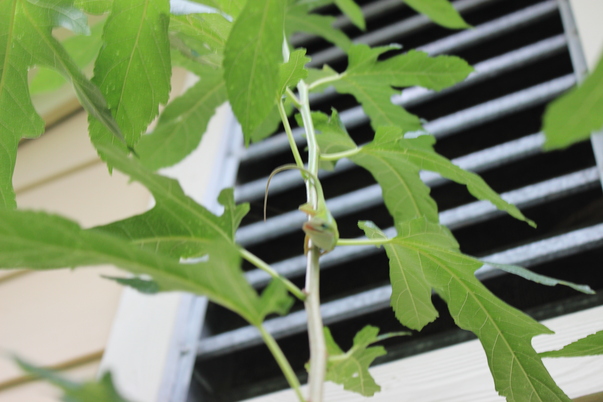While cutting down one of my backyard trees I came across a lizard eating a grasshopper.