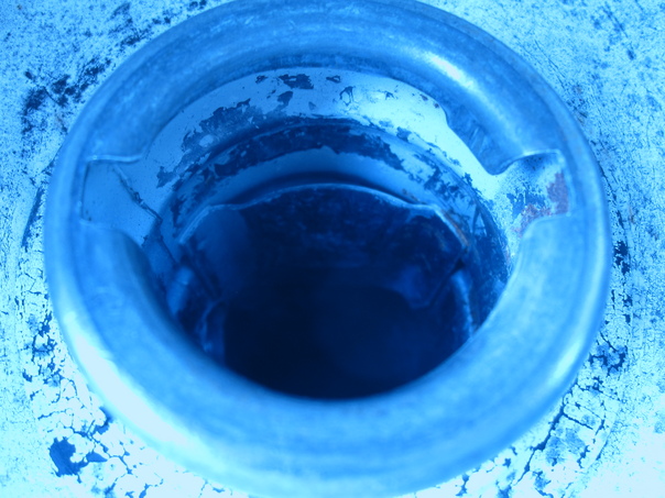 This photo is blue tinged and shows what appears to be a drainage hole in concrete.