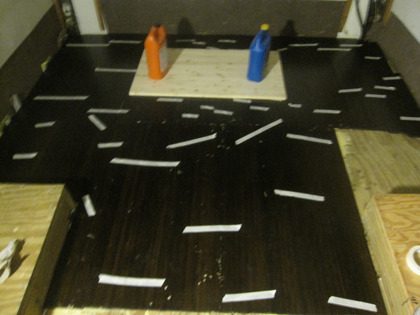 This is an in progress photo of a dark brown finish floor being laid over a plywood subfloor with white tape to hold the joints together and a plywood panel with weights to hold down a section while it dries.