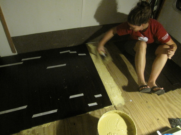 a girl in a red shirt sits in the corner laying light tan material on the floor for flooring