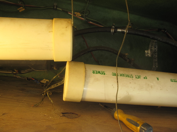 Two white PVC pipes are next to each other in a gloomy lighting setting.