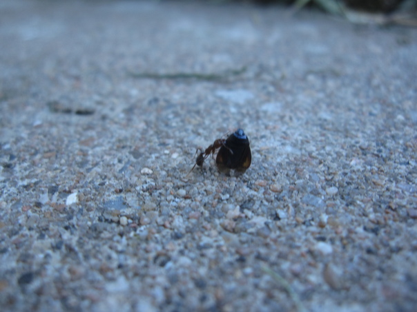 This ant is standing on his hind legs on small gravel anxiously gnawing at his prey.