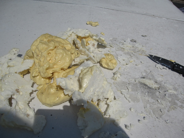 a sharp serrated knife with black handles lying on the side with what appears to be a mess from cutting an ice cream cake with frosting everywhere.
