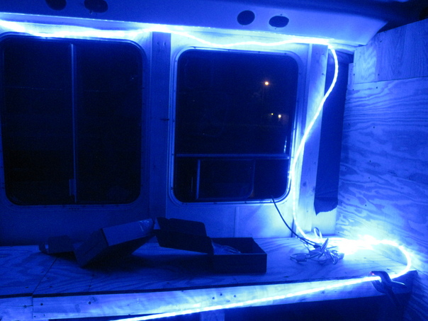 The small room is lit with a blue string lining and is lined with plywood.