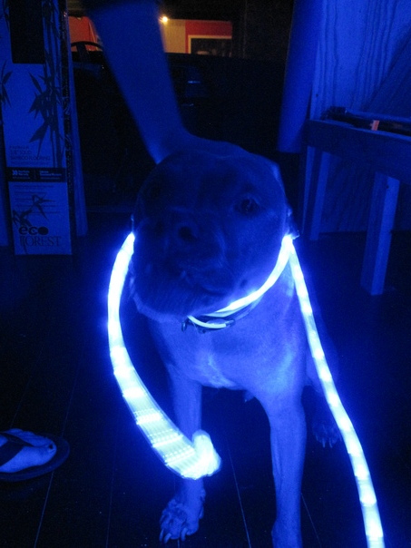 unhappy dog at night wrapped in blue lights