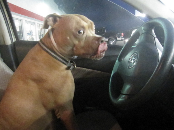 A brown pitbull is sitting in the driver's seat of a Toyota car.
