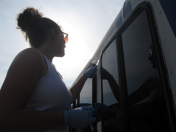 Woman wearing sunglasses and wearing plastic gloves standing next to a vehicle window with her image reflecting back.