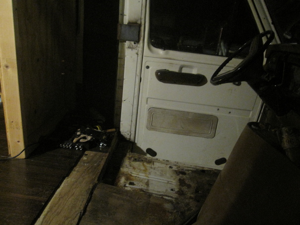 The inside of a van or truck that is missing the drivers seat.