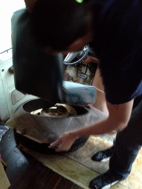 A man adding an upholstered to a seating column in an old vehicle.