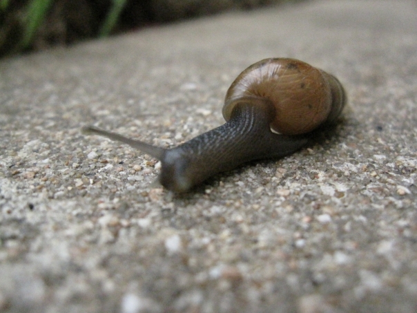 This photo shows a snail making its way on a concrete surface with one antenna extended to it's fullest.