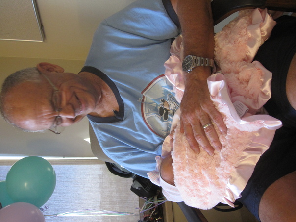 A proud grandfather holding his baby grand daughter in his lap while sitting down in a room with balloons hung on the walls
