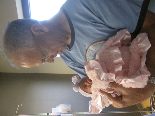 An older man holding a baby girl wrapped in a bank blanket with a pink bow.