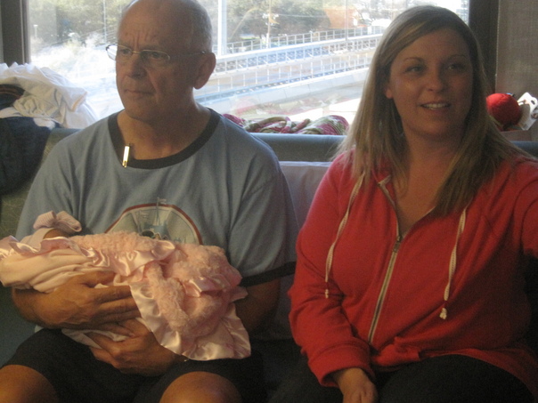 A man sitting alongwith a woman is carrying a new born baby in his hands.