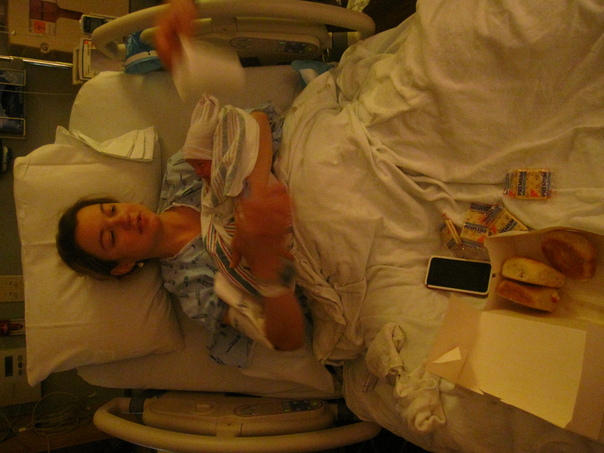 A woman cradles her newborn infant in a hospital bed that is littered with a food box and crackers.