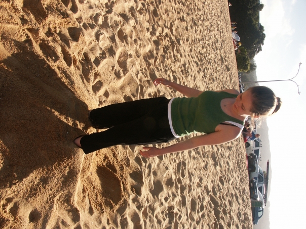 Young woman standing in brown sand above her ankles while wearing active-wear clothing.