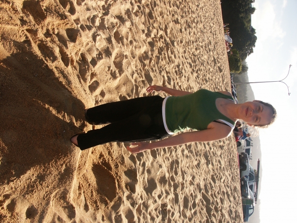 The petite woman in yoga pants and a green tank top hides her feet in the sand.