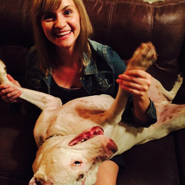 A pretty young lady holding a dog in her lap.