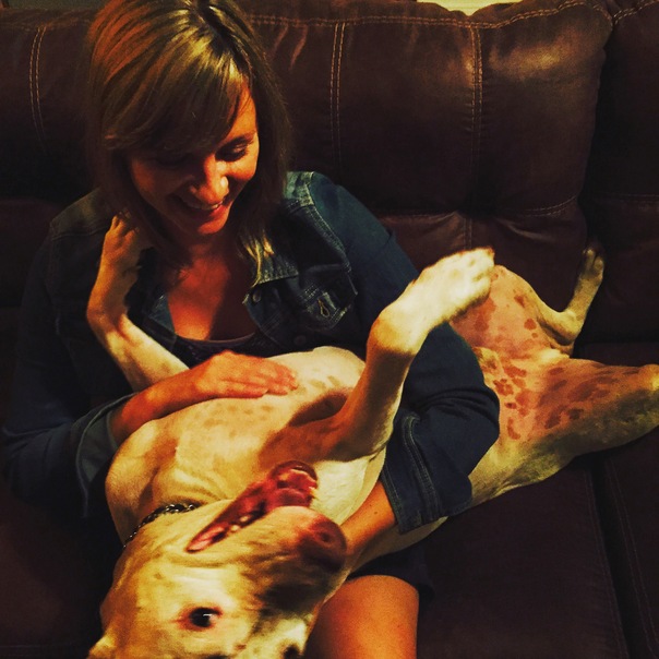A young woman with brown hair is happily playing with a tan and white pitbull terrier.