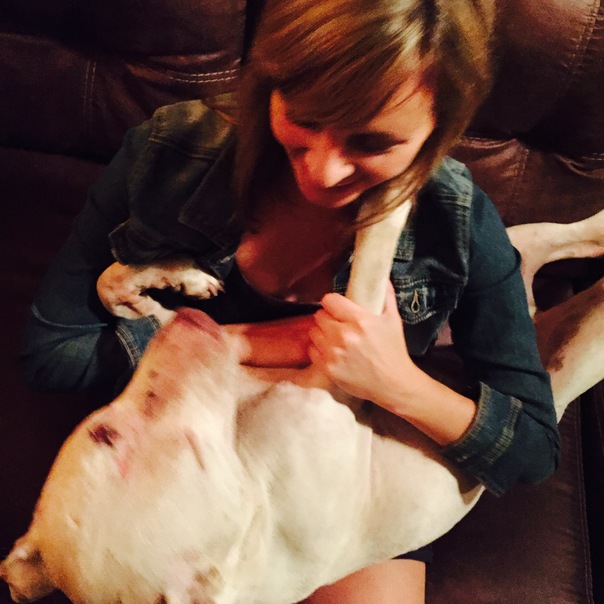 a woman having fun and playing with a white dog white sitting on a black fluffy couch