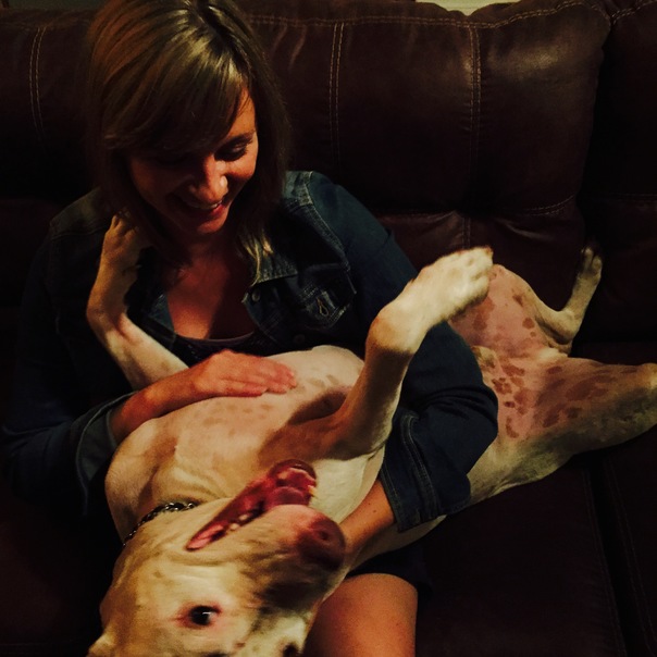 The spotted dog is overjoyed by his pretty master rubbing his belly.