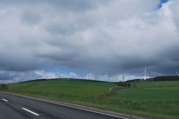 A beautiful partly cloudy day passing by wind turbines on a drive.